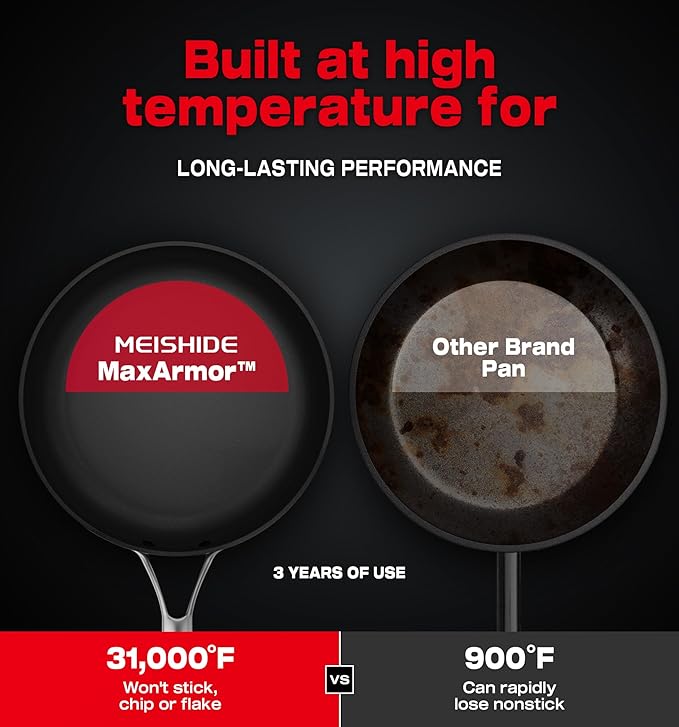 - 100% Non-Toxic & No PFAS/PFOS/PFOA/BPA: Proven Safety - A team led by Dr. Takahashi (with members from the University of Tokyo and California Institute of Technology) has conducted 1,739+ lab tests to ensure zero chemical release even at 500°F, and crafted with our team development MaxArmor nonstick technology coating, healthier cooking with 57.39% less oil. Perfect for eggs, pancakes, or grilled cheese.