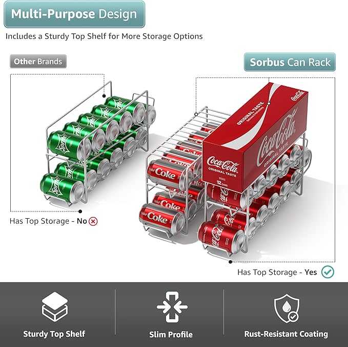 • Sorbus Fridge Can Dispenser (2 Pack, White): This soda can dispenser for refrigerator holds up to 12 standard 12 oz soda cans, making it easy to access and dispense your favorite beverages. Can rack features a convenient top shelf for additional storage. Organizer also works great for storing small food cans and other pantry items.