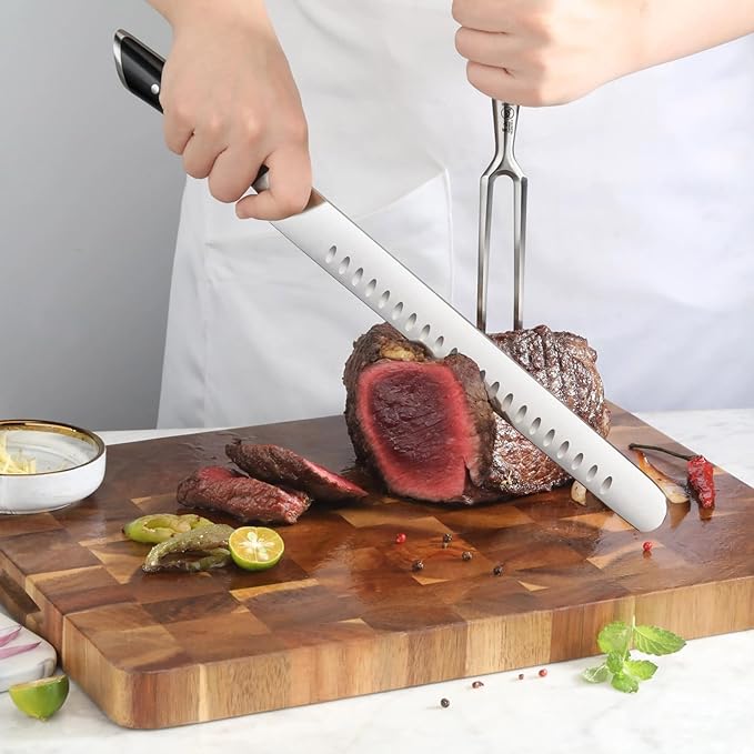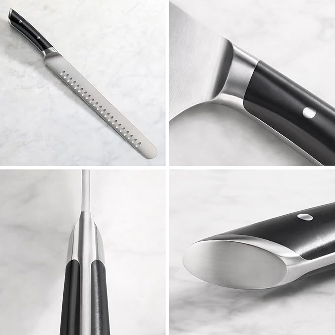 • The Slicing Knife features a full-tang, precision-honed blade that ensures lasting sharpness and stability. It effortlessly glides through meats and roasts, providing smooth, uniform cuts for easy, efficient slicing.