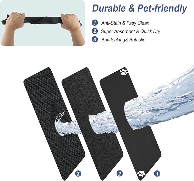 • Pet Feeding Mat:absorbent dog mat for food and water bowl,no stains quick dry dog water dispenser mat,dog accessories pet supplies,dog water bowl for messy drinkers,this pet food mat can prevent liquid from overflowing. super absorbent and quick-drying ability to avoid wetting pet paws even for messy drinkers. sturdy dog & cat food bowl mat cannot be torn easily and avoid eating by mistake. keep the pet's eating environment tidy and clean.