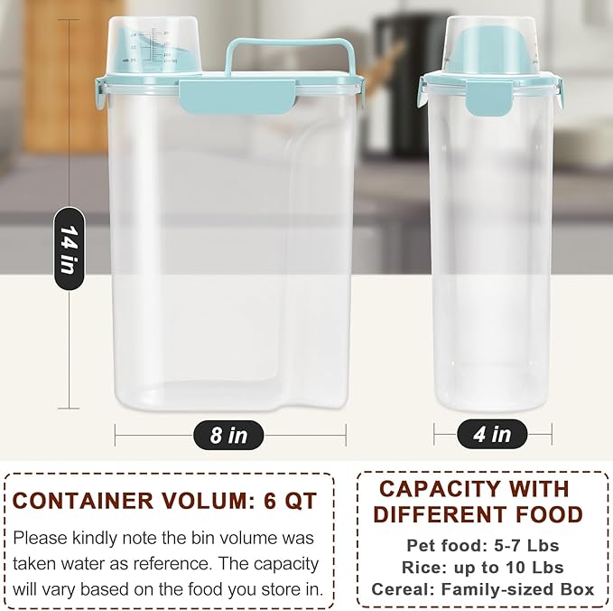 • Large Pet Food Container: The capacity of TBMax dog food storage container is 6-quart that can hold about a 5 -7 lbs bag of dry dog food or cat food, which depending on the particles of the pet food. Ideal for storing small pet food like kitten puppy kibble, bird seeds, fish food and more