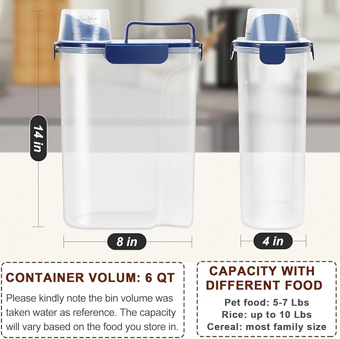 • Airtight Cat Food Container: With the snap-lock latches and silicone gaskets, the cat food storage container can shut tightly to ensure pet food stay super fresh. You dog or cat won't open the container and make a mess any more