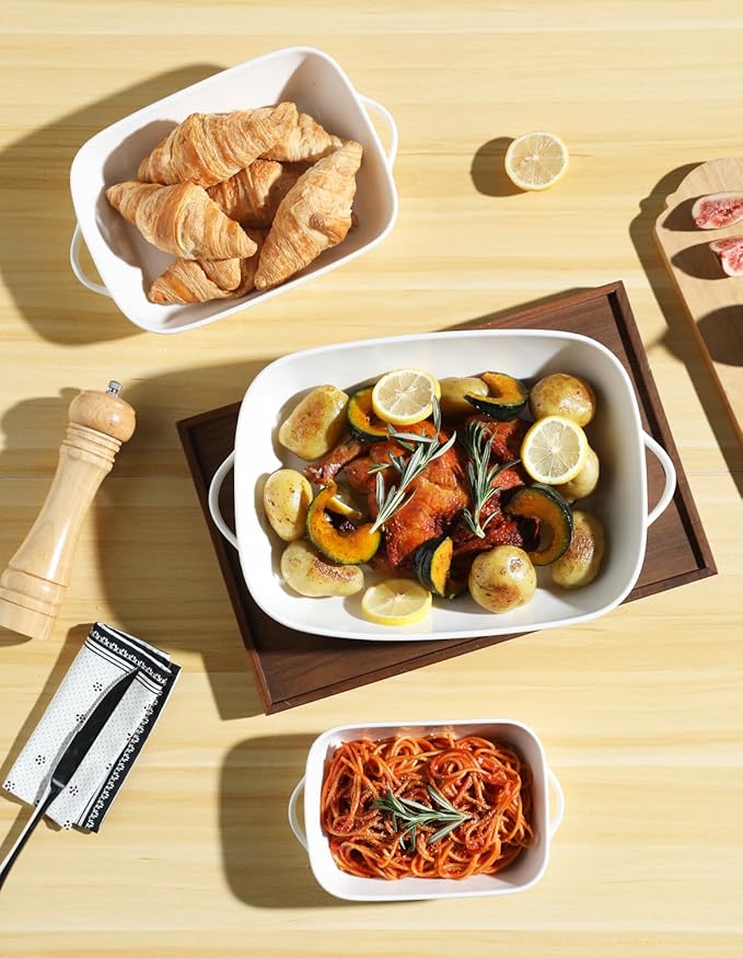 • 【MEET ALL BAKING NEEDS】The ceramic baking dishes set made of safe materials, suitable for heating and storage of bread, pasta, casseroles, lasagnas, roasts, chicken, barbecue, beef, vegetable food, to meet your different needs.