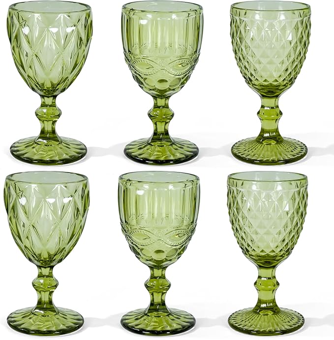 Vintage Wine Glasses Set of 6, 12 OZ Colored Glass Water Goblets, Embossed Floral Decorative Crystal Glass Cups Set, Dishwasher Safe, for Wedding, Party, Red Wine Glass, Bars, Restaurants
