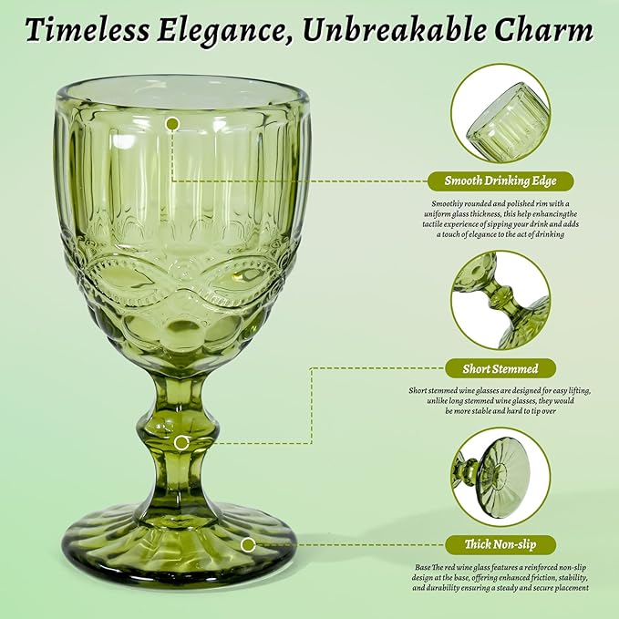 • Versatile Usage: These vintage-style wine glasses are not limited to wine alone. They can be used for a variety of beverages such as juice, soda, iced tea, and water. This versatility makes them suitable for any occasion, whether it's a casual gathering or a formal celebration. You can use them for everyday use or reserve them for special events, making them a practical and versatile addition to your glassware collection.