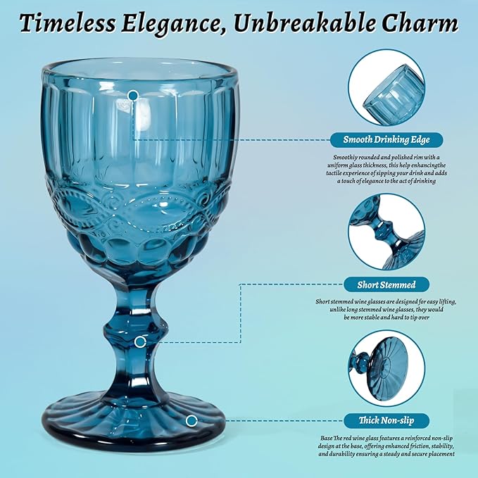 • Versatile Usage: These vintage-style wine glasses are not limited to wine alone. They can be used for a variety of beverages such as juice, soda, iced tea, and water. This versatility makes them suitable for any occasion, whether it's a casual gathering or a formal celebration. You can use them for everyday use or reserve them for special events, making them a practical and versatile addition to your glassware collection.