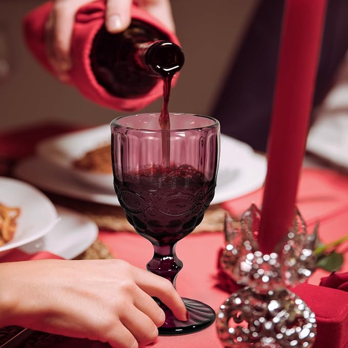 Vintage Wine Glasses Set of 6, 12 OZ Colored Glass Water Goblets, Embossed Floral Decorative Crystal Glass Cups Set, Dishwasher Safe, for Wedding, Party, Red Wine Glass, Bars, Restaurants