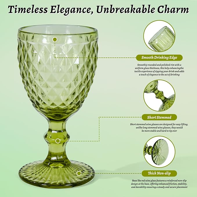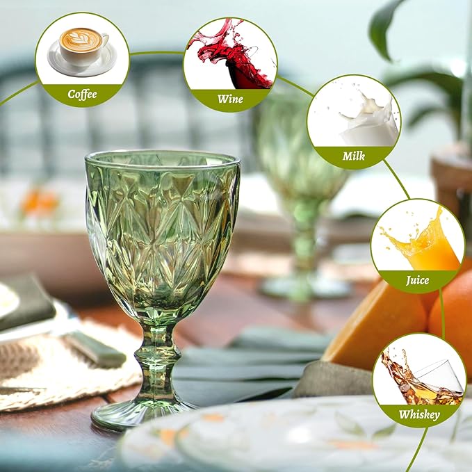 Vintage Wine Glasses Set of 6, 12 OZ Colored Glass Water Goblets, Embossed Floral Decorative Crystal Glass Cups Set, Dishwasher Safe, for Wedding, Party, Red Wine Glass, Bars, Restaurants