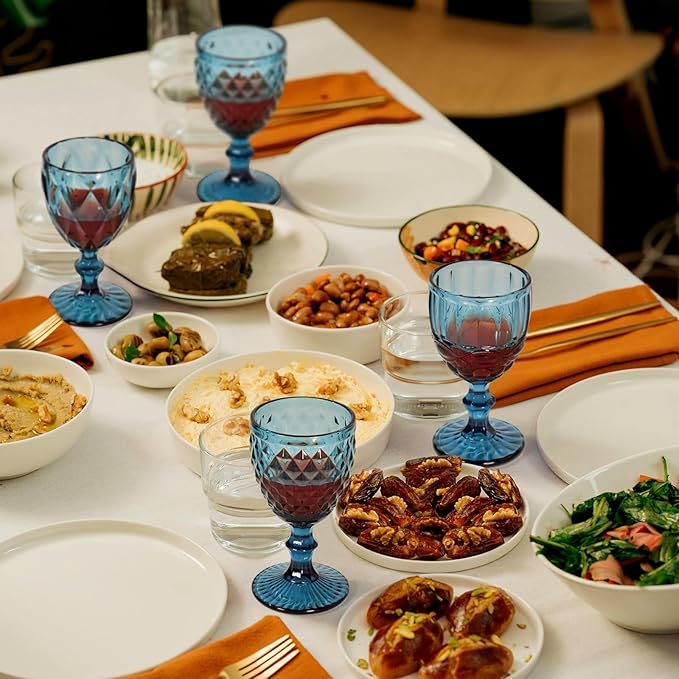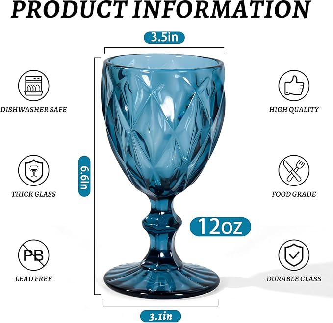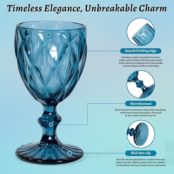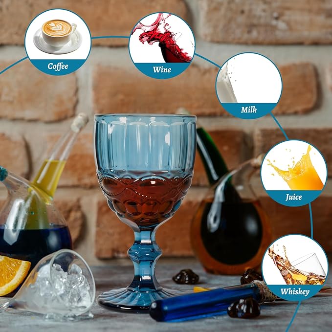 Vintage Wine Glasses Set of 6, 12 OZ Colored Glass Water Goblets, Embossed Floral Decorative Crystal Glass Cups Set, Dishwasher Safe, for Wedding, Party, Red Wine Glass, Bars, Restaurants