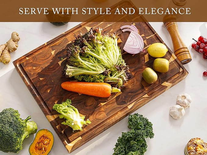 • End-Grain Construction Make This Wooden Cutting Board Long-Lasting & Knife-Friendly;Our end-grain design absorbs impact, reducing knife dullness and preventing deep cuts. Acacia wood is naturally hard and moisture-resistant, ensuring years of use without warping or cracking