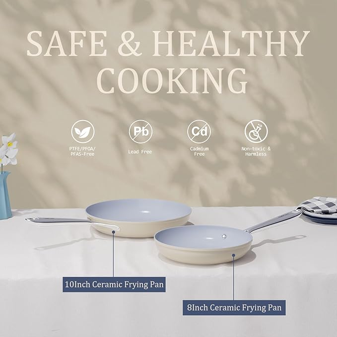 - ๐๐ฟ๐ฎ๐ณ๐๐ฒ๐ฑ ๐ช๐ถ๐๐ต๐ผ๐๐ ๐๐ฎ๐ฟ๐บ๐ณ๐๐น ๐๐ต๐ฒ๐บ๐ถ๐ฐ๐ฎ๐น๐ & ๐ก๐ผ ๐ฃ๐๐๐ฆ/๐ฃ๐ง๐๐/๐ฃ๐๐ข๐ - Superior to Traditional Non-Stick Coating Pans: Crafted with 3X Durable Ceramic Coating, our 10-inch nonstick frying pan is 100% free from PFAS, PTFE, PFOA, lead, and cadmium. Healthier cooking with 50% less oil โ perfect for eggs, pancakes, or grilled cheese. Proven Safety: 800+ lab tests ensure zero chemical release even at 500ยฐF.
