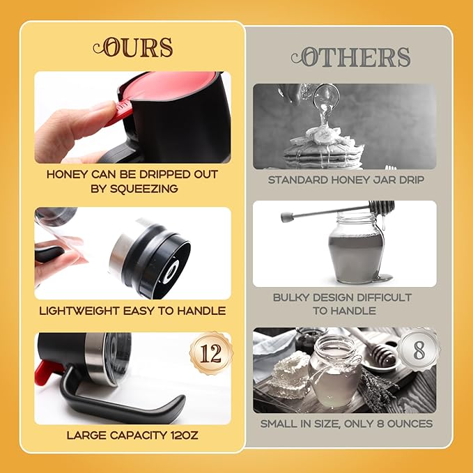 • Upgrade 12OZ Capacity: Our honey container can hold 12 ounces of honey and can also hold chocolate syrup, maple syrup, olive oil, salad dressing, and more. Whether poured on pancakes or salads, it will bring a better taste experience
