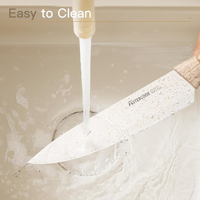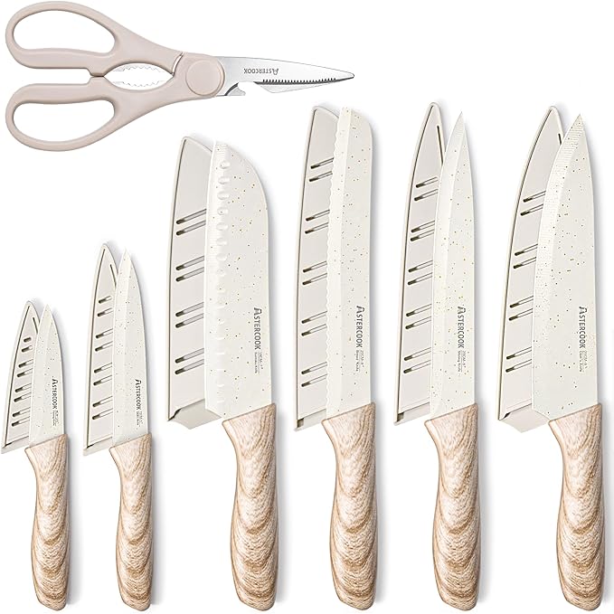 Astercook Knife Set, 13 Pieces Kitchen Knives Set with Ceramic Coating, Stainless Steel Chef Knife Sets with 6 Blade Guards, Dishwasher Safe Sashimi Knives For Fish with Wooden Handle, White