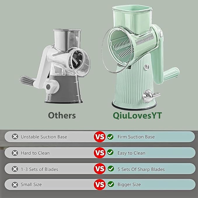 • Innovative Safety Mechanism: QiuLovesYT rotary graters for kitchen is designed with a patented pusher cup that eliminates the need to touch sharp blades, ensuring a 100% safe grating experience. Crafted with 420J2 stainless steel blades and food-grade BPA-free ABS plastic, guarantees daily use that's both healthy and worry-free