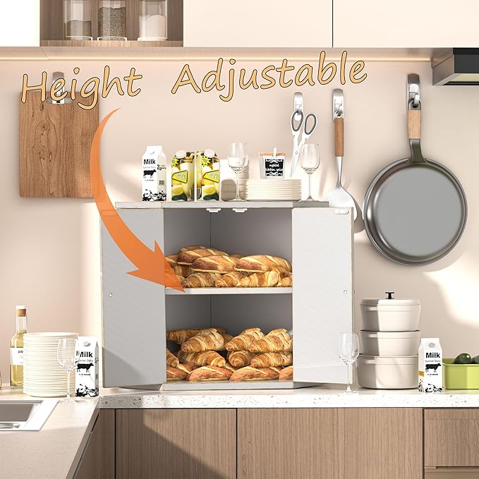 • Large Capacity For Your Family: While other bread boxes for kitchen counter can only hold 1 loaf of bread. Our 2-layer countertop breadbox can hold a giant pile of bread, rolls, bagels, tortillas, muffins and more. Effectively avoid the deformation of bread due to extrusion. It’s ideal for a large family and helps to declutter your countertops