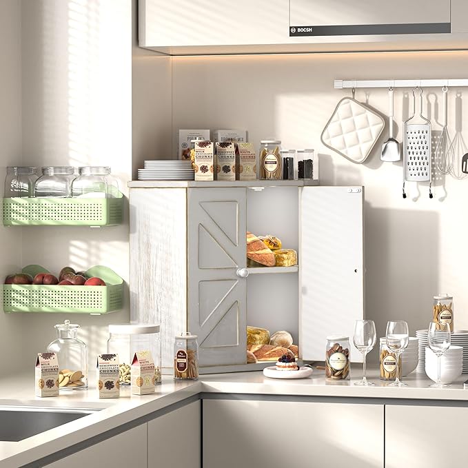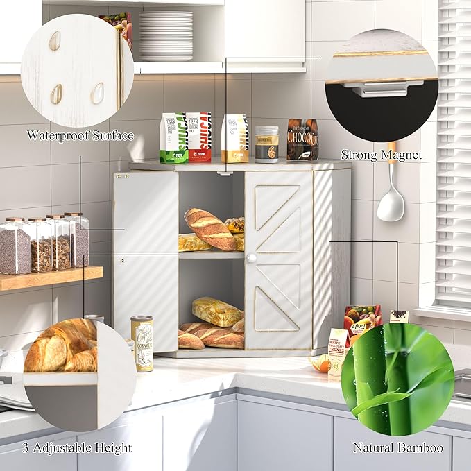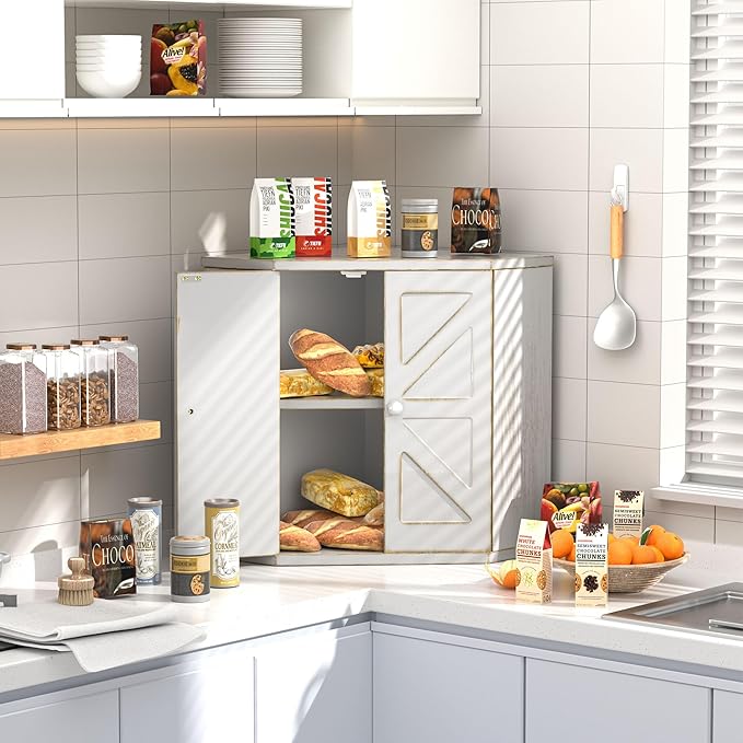 Corner Bread Box for Kitchen Countertop, Storage Container for Homemade Bread, Double Layer BreadBox, Large Capacity Bread Storage Bin, Vintage Farmhouse Breadbox Organizer,Antique White