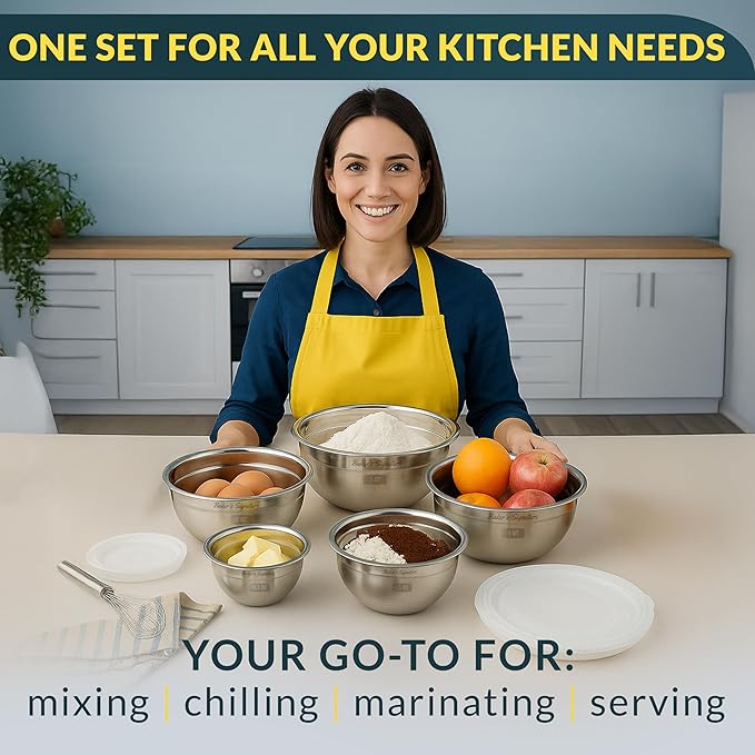 • ONE SET - MULTIPLE USES: This stainless steel mixing bowls set of 5 includes 0.5QT, 1.5QT, 3QT, 4QT, and 5QT sizes—perfect as a salad mixing bowl, meal prep bowl, or for everyday kitchen use.