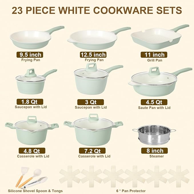 • 23pcs Cookware Set Includes - 9.5 inch + 12.5 inch Frying Pan, 4.8qt + 7.2QT Casserole with Lid, 4.5qt Saute Pan with Lid, 1.8qt+ 3qt Sauce Pan with Lid, 11 inch Grill Pan, 8 inch steamer, Pan Protector*6, Silicone Shovel Spoon & Tongs.