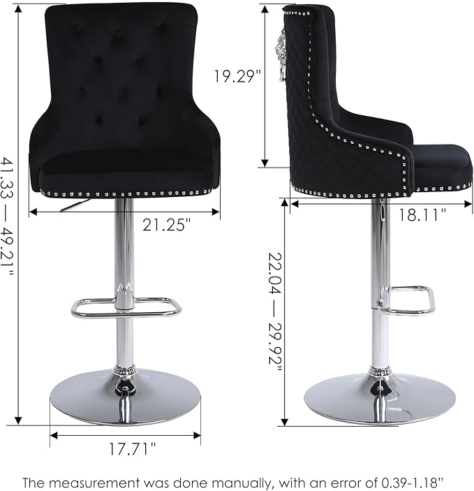 • Modern Barstools: The back of this bar chair is designed with a lion's head pull ring to make it easier to take out. The tufted back with buttons gives the stools more elegant appearance. The entire velvet barstool is decorated with nailhead surrounds to give the chair a more stylish look.