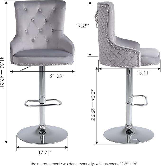 • Modern Barstools: The back of this bar chair is designed with a lion's head pull ring to make it easier to take out. The tufted back with buttons gives the stools more elegant appearance. The entire velvet barstool is decorated with nailhead surrounds to give the chair a more stylish look.