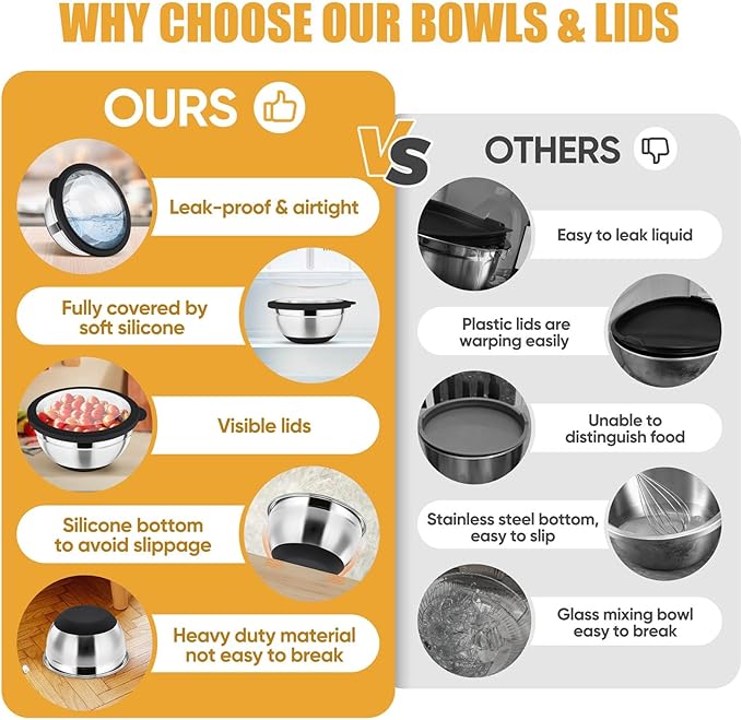 - 【Upgraded Transparent Black Lids】-- Each mixing bowl matched with fitting visible lid, See-through plastic lids could keep food fresh and letting you see what’s inside without opening, Avoid the hassle of rummage, Silicone seal all-around wrapped plastic cover, Offer a snug air-tight fit to the bowl to create an airtight storage container, Dust proof and avoid food spilling and leaking, Convenient to transport food for camping, The protruding lid handle design make lid easier to open