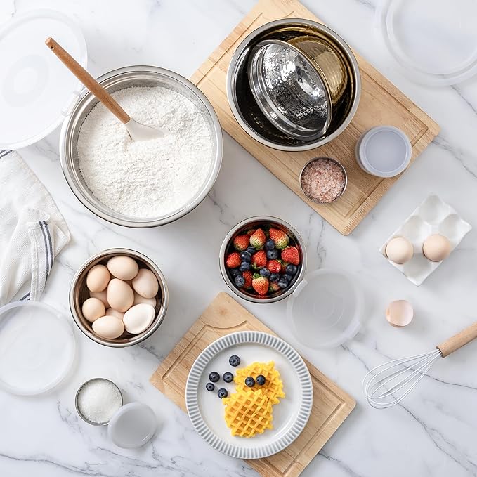 • Elegance Meets Function – These beautiful stainless steel mixing bowls with lids add style and function to your kitchen. Perfect for meal prep, freezer, serving, or display, they elevate everyday cooking & baking with a touch of sophistication.