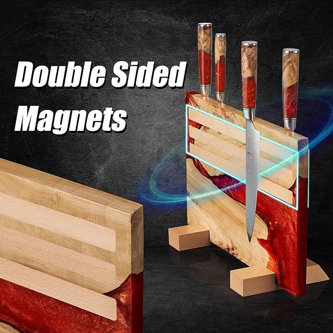 • 【 Ultra-Strong Neodymium Magnets 】 Powerful hidden magnets built into the wood block draw in the blade of your kitchen knives, allowing for quick and easy storage as well as aesthetic display.