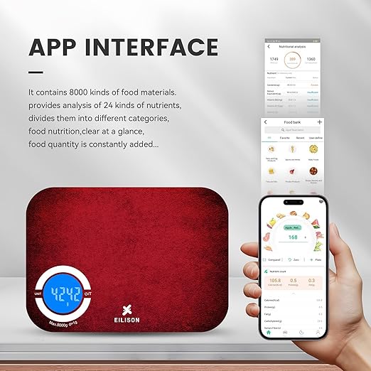 EILISON Smart Kitchen Scale with Bluetooth App, High-Precision Digital Food Scale for Baking, Cooking & Diet, 8000 Food Database, 24 Nutrients, Touchscreen, Tare Function, 5g-8000g Capacity (Red)