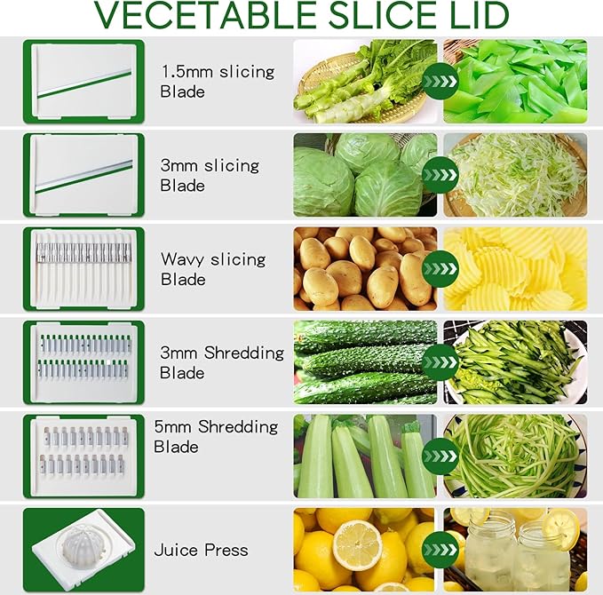 • ✔️【9-in-1 Space Saving Kitchen Tool】Combine salad spinner + vegetable slicer + shredder + colander + garlic grater + juice squeezer + egg separator + mixing bowl + food storage container in 1 set (with 5 interchangeable blades)