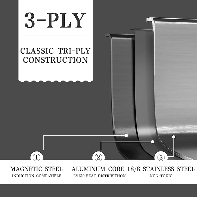 • Suitable for All Stoves: Works on all stovetops, including induction. The high-quality stainless steel and the aluminum core make it dishwasher-safe and oven-safe up to 550°F