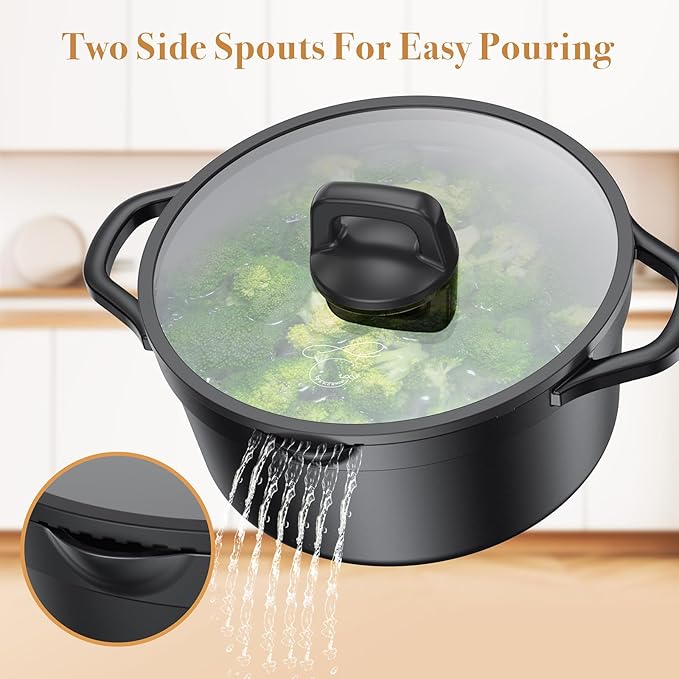 • Dual Pour Spouts: Say goodbye to messy spills! Our nonstick pots and pans feature two precision spouts for effortless, drip-free pouring—whether it’s sauces, soups, or excess oil. Designed for both lefties and righties, because everyone deserves a smooth pour!