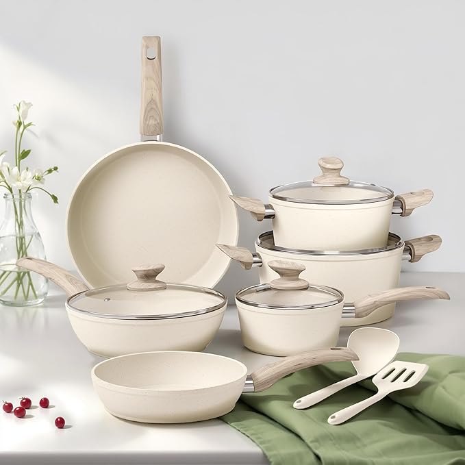 DisDelight Pots and Pans Set Non Stick, Nonstick Induction Granite Kitchen Cookware Sets, Induction Nonstick Granite Cooking Set, Induction Cookware Cooking Pan Set, Pan Sets for Cooking, Cream White