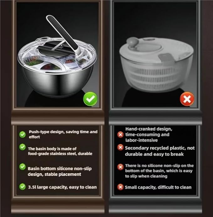 - 3.Quick Press Type and One Handed Operation Salad Spinner: Our easy pump handle makes spinning effortless Press the handle, the inner basket will rotate smoothly and stable at high speed, It can save you time and effort, and quickly shake off moisture,so you can enjoy the convenience of a quick, mess-free, and tasty salad.ts easy one-hand pump mechanism transforms tedious spinning into a swift, enjoyable experience, making it the ultimate lettuce spinner for your kitchen.