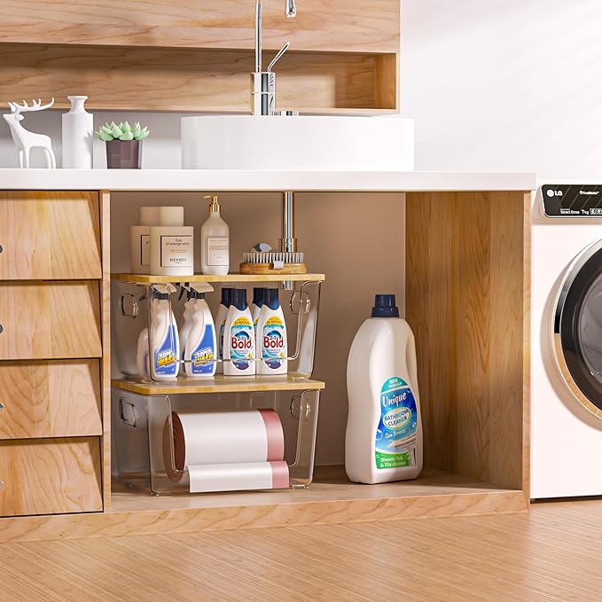 4 Set Pantry Organizer and Storage, Stackable Trash Bag Dispenser Clear Acrylic Kitchen Counter Pantry Baskets for Potato, Onion, Produce, Fruit, Vegetable, Snack, Trash Bag Holder with Bamboo Top