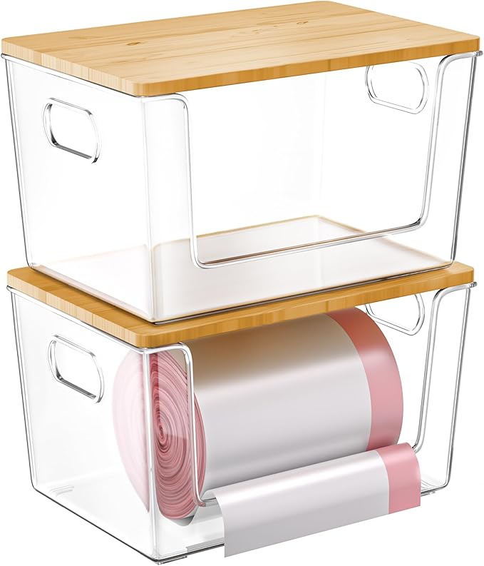 2 Set Pantry Organizer and Storage, Stackable Trash Bag Dispenser Clear Acrylic Kitchen Counter Pantry Baskets for Potato, Onion, Produce, Fruit, Vegetable, Snack, Trash Bag Holder with Bamboo Lid