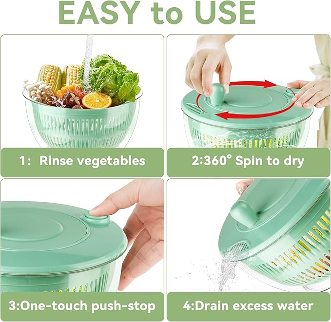 • Convenient storage: This salad spinner is compact and all of the accessories can be incorporated into the bowl for easy storage and organization, the salad bowl suitable for family use, one-time to meet the needs of the 1-4 people.