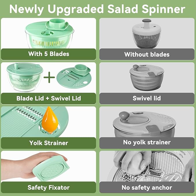 YUANYE Salad Spinner Large, 3 IN 1 Vegetable and Fruit Washing Bowl with Strainer, Lettuce Spinner with 5 Blades Slicer, Egg Yolk Strainer, Salad Bowl for Efficient Salad Preparation, 5.3 Qt