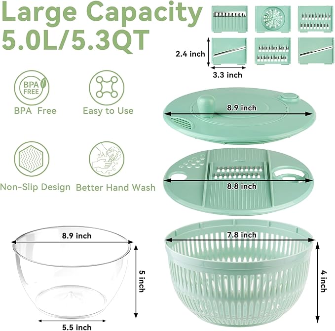 • 3 IN 1 Multifunctional Kitchen Gadget: This salad spinner with strainer and shredding blade can be used for washing, chopping vegetables, leaving foods crisp and 95% drier. It also includes a salad bowl and a clip for mixing salads.5.3L large capacity measures 9.25 x 5.52 inches.