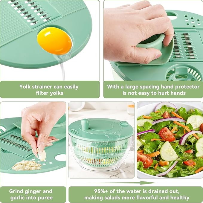 • Upgrade Function: This fruit washer spinner bowl features a lid designed to separate egg yolks and a juicer for making juice. The lid of this salad bowl can be used to grate both garlic and ginger, and it comes with a slicer and julienne cutter.