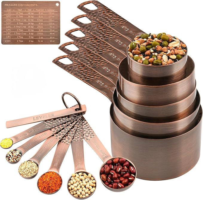 • ▲▲MEASURING CUPS AND SPOONS SET OF 13: 5 copper measuring cups set:1/8CUP-30ML;1/4CUP-60ML;1/3CUP-80ML; 1/2 CUP-120ML; 1CUP-240ML; 6 copper measuring spoons set:1/8tsp-0.6ML;1/4tsp-1.25M;1/2 tsp-2.5ML; 1tsp-5ML;1/2tbsp-7.5ML; 1tbsp-15M; 1 X Leveler and 1 measure equivalents.