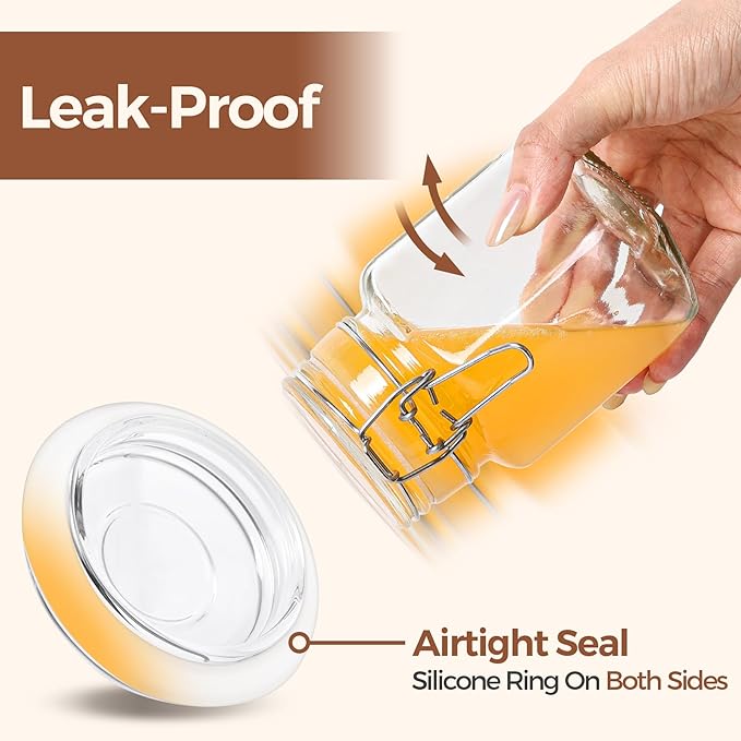• Leak-Proof Small Jars: These food-grade 8oz glass jars with lids feature silicone gaskets and stainless steel clips for airtight sealing. Ideal for keeping food fresh for storing liquids like dressings, sauces, soups and jam