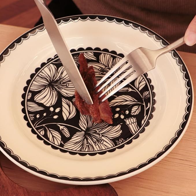 • 【How to Care】Please use a mild dish soap and warm water to clean the silverware. Avoid using steel wire brushes, hard sponges, or any other abrasive cleaning tools, as they can cause damage to the flatware.