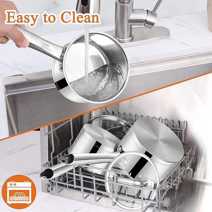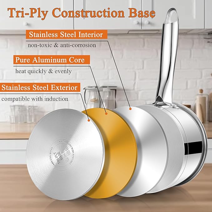 • Suitable for all Stovetops: the stainless steel saucepan is constructed of try-ply bottom, with an aluminum core for even heat distribution and quick heating, also compatible with all cooktops, including induction, gas, electric, and ceramic, meets your versatile cooking needs