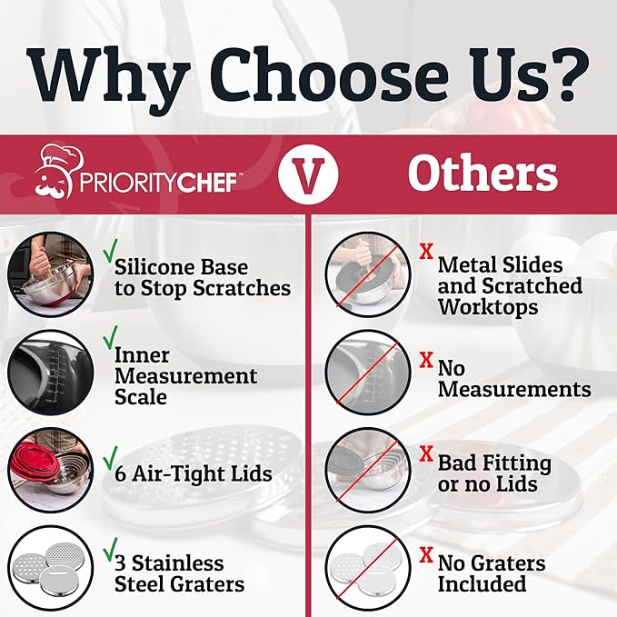 Priority Chef Stainless Steel Mixing Bowls with Lids Set - Premium 30Pcs with 6pc Metal Bowl Set for Kitchen, 3 Graters, Airtight Lids, Non-Slip Bases & Silicone Utensils, Red