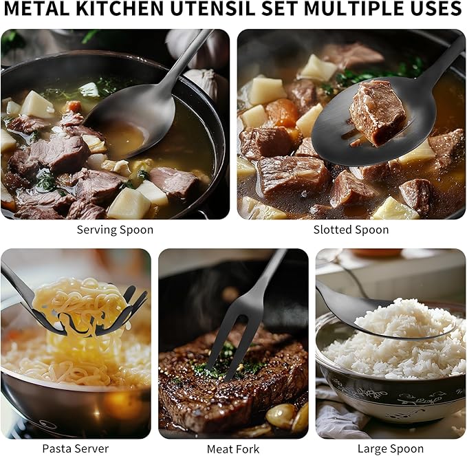 • 10Pcs Black Kitchen Utensils Set: includes Slotted Spatula, Spaghetti Server, Draining Spoon, Ladle, Cooking Fork, Utensil Crock And Non-Slotted Spatula. Perfectly meet your cooking needs and enhance your cooking experience