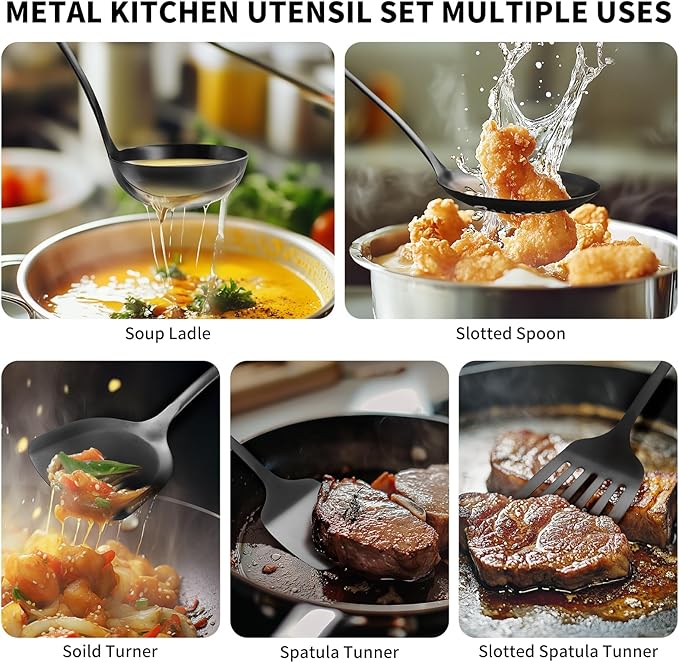 304 Stainlss Steel Kitchen Utensils Set, 10 Pcs Metal Cooking Utensil, Matte Kitchen Gadget Cookware and Kitchen Tool Set, Dishwasher Safe(Black)