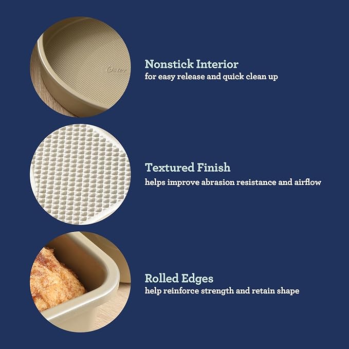 • TEXTURED FINISH: The interior also features a textured finish to help improve abrasion resistance. It protects each piece of bakeware from scratching and scraping. It also encourages better airflow to avoid overcrisping and producing burnt edges.