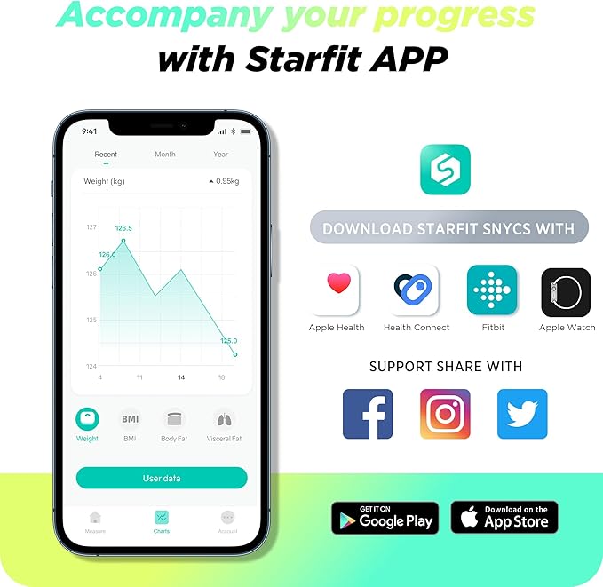 • SMART APP FITNESS TRACKING: Using the Starfit app allows you to set goals, analyze trends and track your health progress by week, month, and year. Can also generate and print detailed health analysis reports in the APP, and easily sync data with Apple Health, Health Connect, and F1tbit, or share with friends on social media