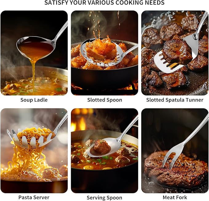 • 6 Pcs Kitchen Utensils Set: Lazycorner Utensils Serving Set consists of 1 Slotted Spatula Tunner, 1 Soup Ladle, 1 Spaghetti Spoon, 1 Meat Fork, 1 Skimmer Spoon, 1 Solid Serving Spoon. Enhance your cooking experience with 6 kitchen accessories that perfectly for your cooking needs