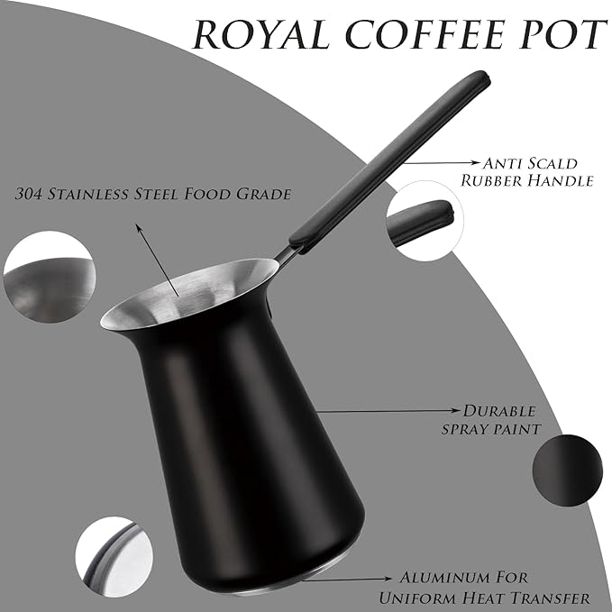 • STAINLESS STEEL MATERIAL: Crafted from high-quality food-grade 304 stainless steel, this Stainless Steel Turkish Coffee Pot is built to last. It’s rust-resistant, easy to clean, and withstands high temperatures without deformation. The ergonomic rubber handle ensures a comfortable grip and protects against burns, making it a safer choice compared to traditional copper Turkish coffee pot designs